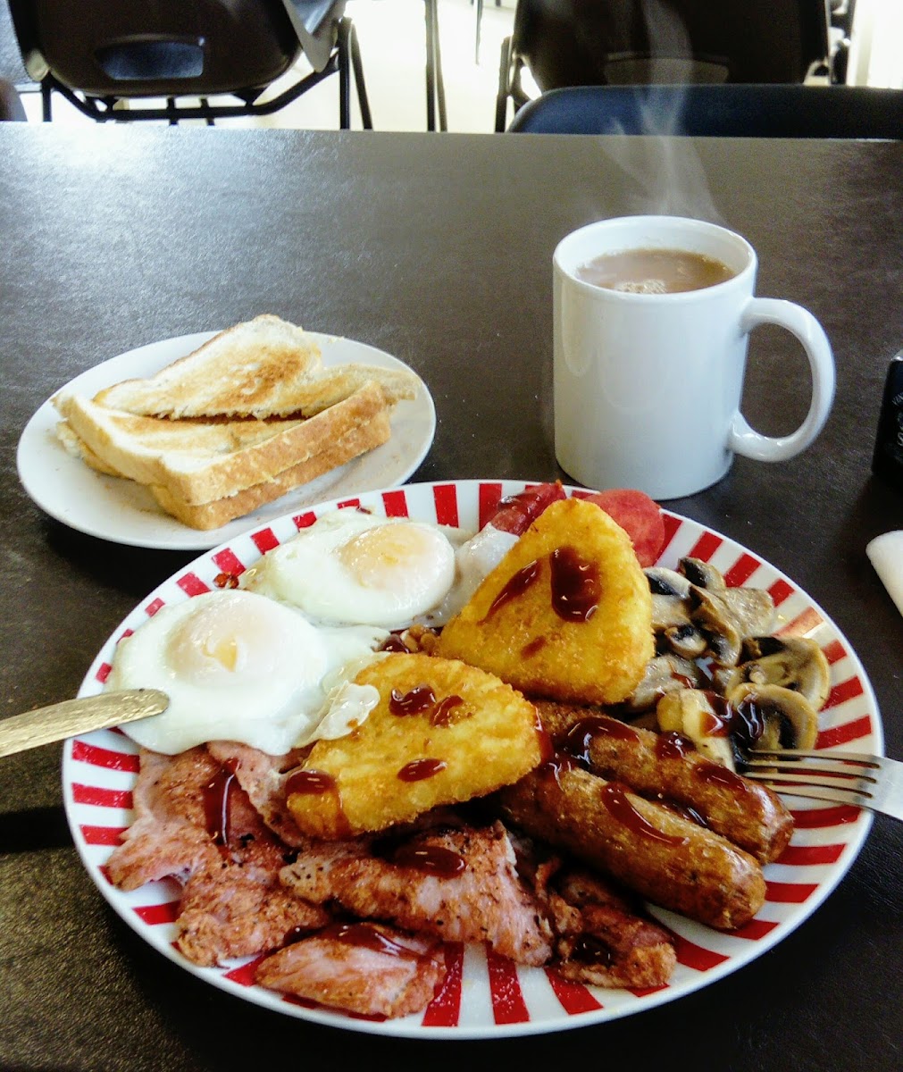 Came here for breakfast while my car was being sorted at bms mini. Was very very impressed with the food. Talk about cheap and plentiful!!!!!! Hubby had the large breakfast. Played well and not just thrown on. Looked really appetising. I had the small breakfast roll. Bacon sausage and mushroom. Thank god I didn’t go large!!! The small was huge and really nice. Best thing the sausages were pork too. Girls were super friendly and the place tidy …. Told everyone today where I’d been ….. great place and I’ll s back